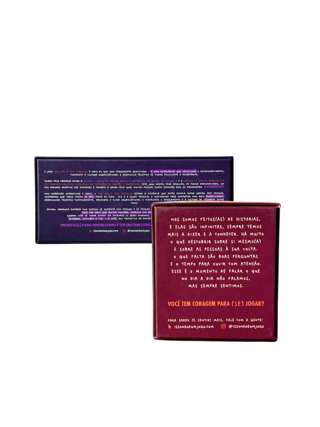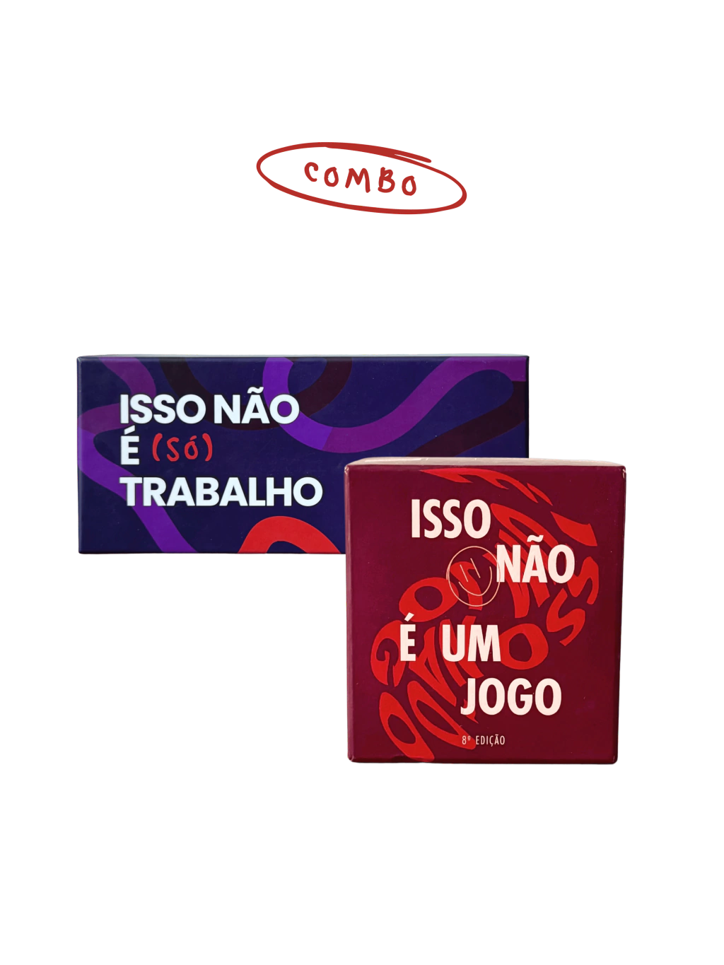 isso não é (só) trabalho - uma ferramenta completa com 4 jogos que acompanham diferentes momentos da jornada de uma pessoa dentro da empresa: contratação, integração, convivência diária, desenvolvimento e feedback. são 300 cartas que provocam reflexão, ampliam visão, fortalecem cultura e ajudam a melhorar comunicação e alinhamento de forma leve, estratégica e divertida;